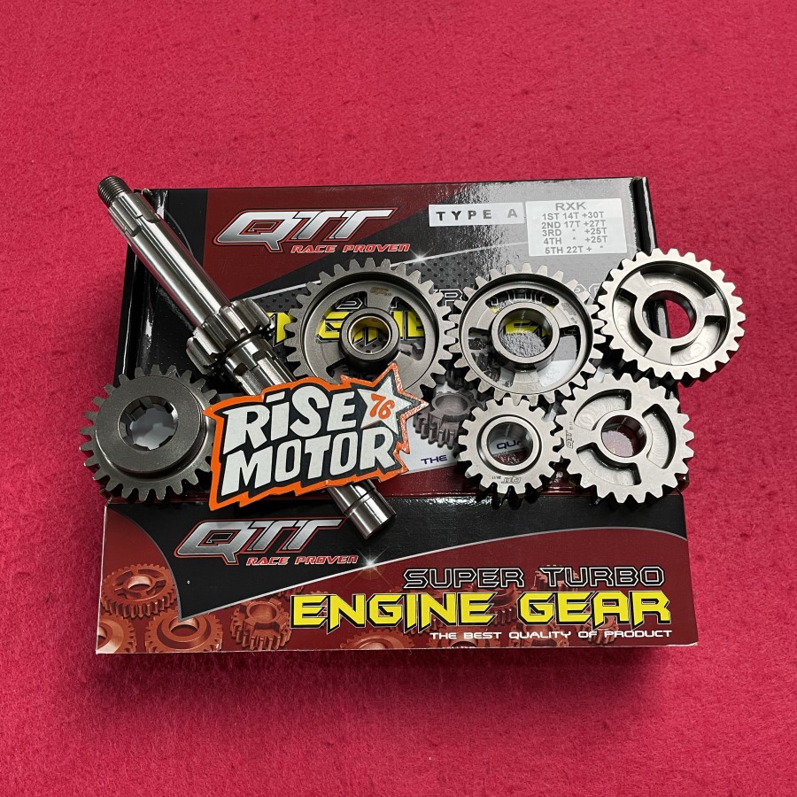 gear ratio merk QTT untuk motor RX King type A ukuran gigi 1 : 14T . 30T gigi 2 : 17T . 27T gigi 3 : STD . 25T gigi 4 : STD . 25T gigi 5 : 22T . STD